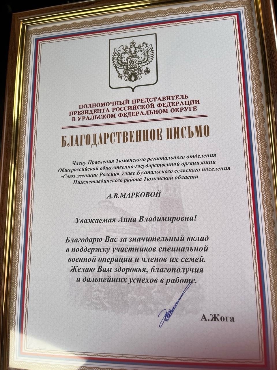 Член правления Тюменского регионального отделения Союза женщин России, руководитель Нижнетавдинского женсовета Анна Маркова отмечена благодарственным письмом полпреда президента РФ в УФО Артема Жоги.