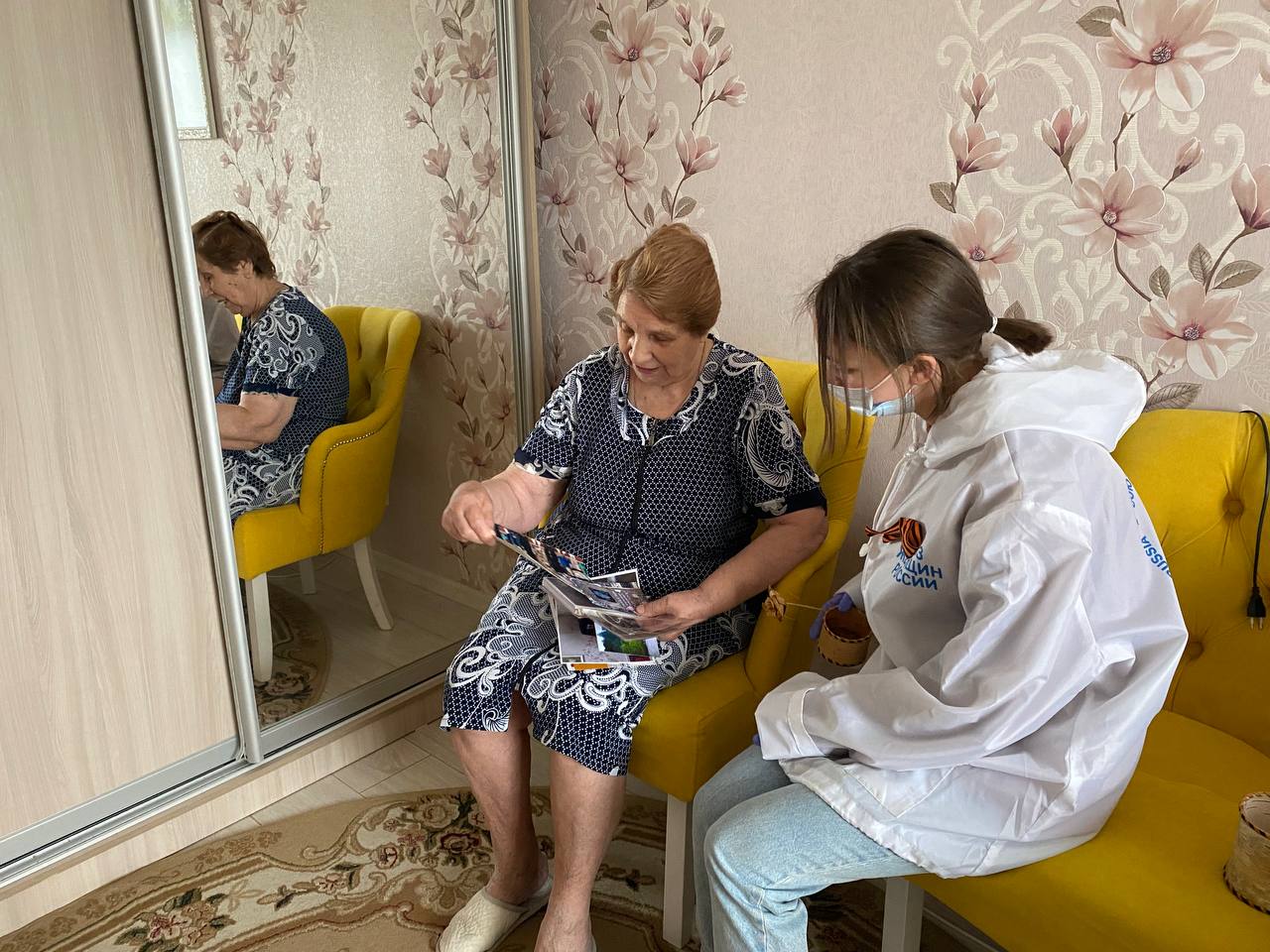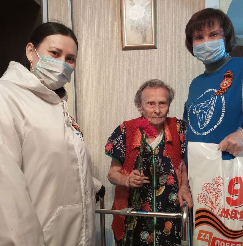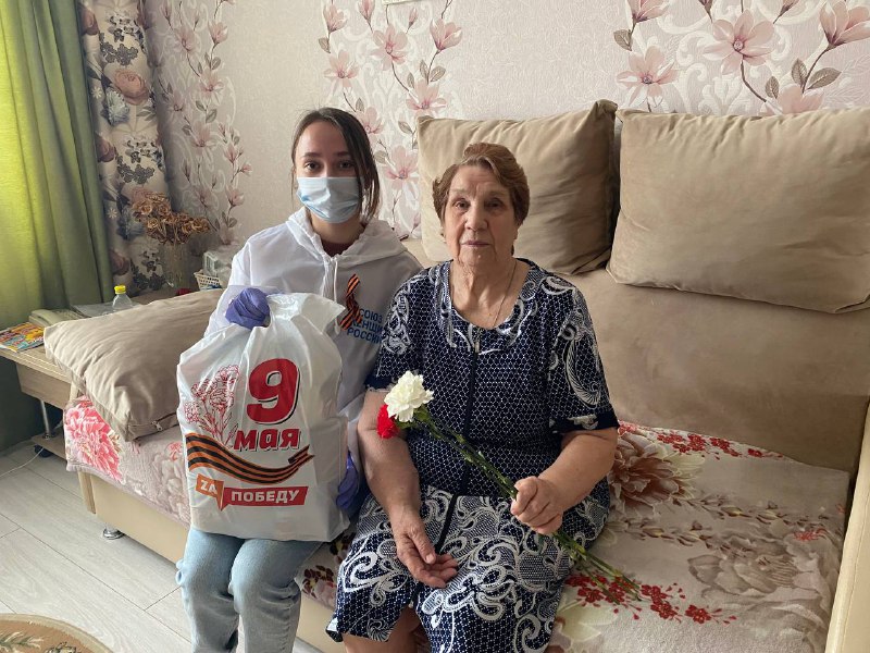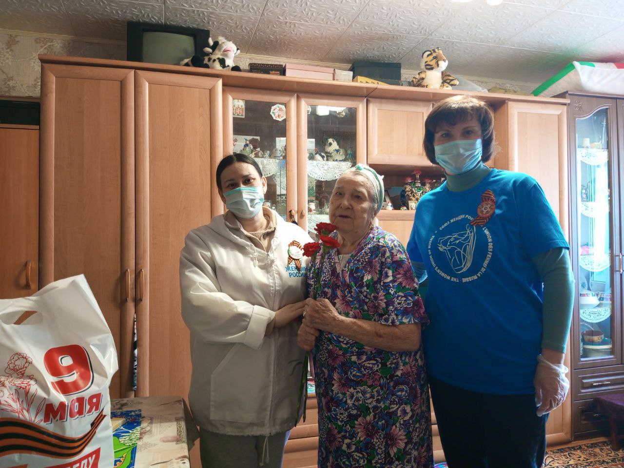 Тех, кто ковал Победу в тылу, волонтёры посещают на дому. В подарок приносят продуктовые наборы и красные гвоздики.